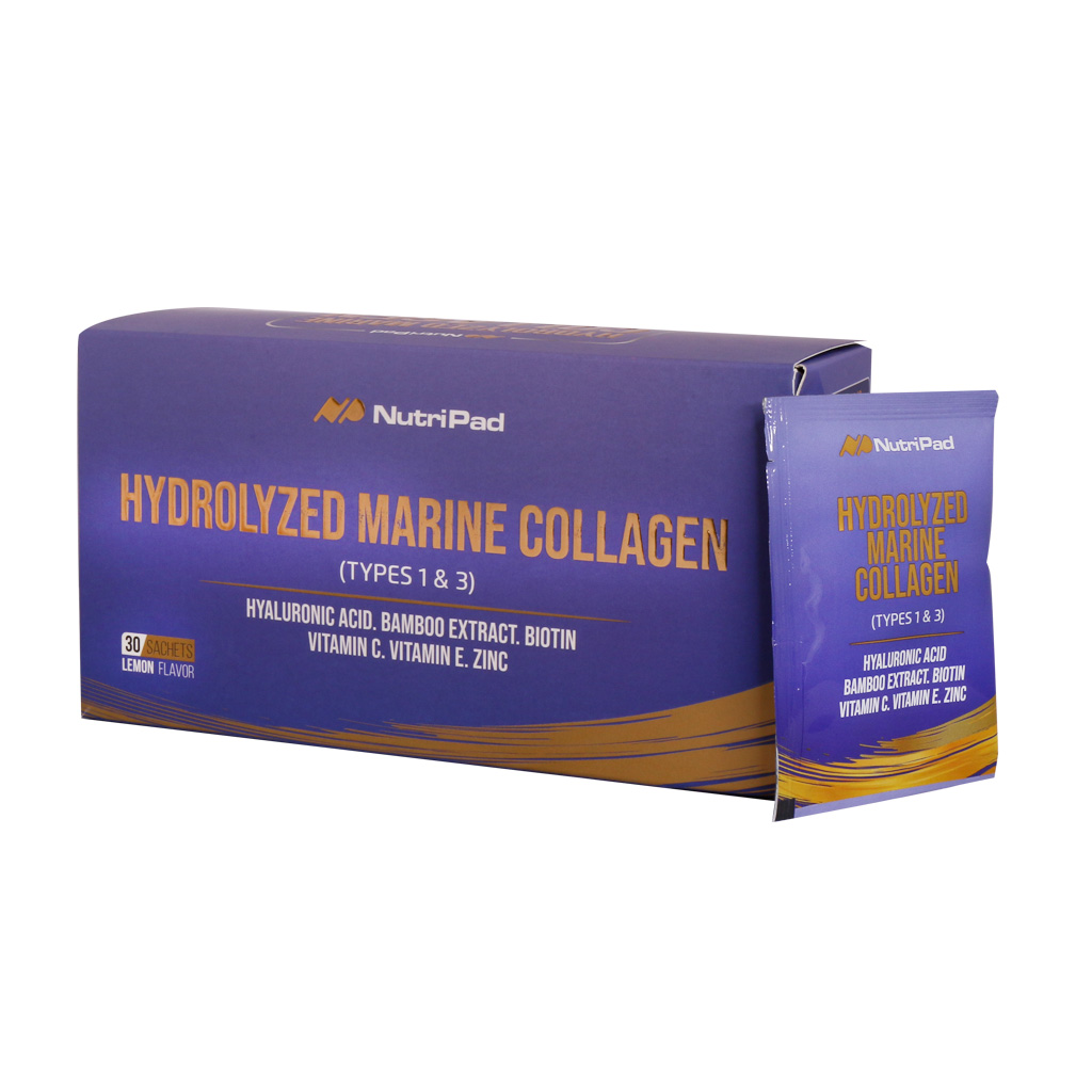 | ساشه کلاژن مارین نوتری پاد 30 عددی (Nutri Pad Hydrolyzed Marine Collagen) ساخت کشور ایران است. این پودر به ساخت کلاژن در بدن کمک می نماید و به حفظ خاصیت کشسانی و جلوگیری از پوست شما به خوبی کمک می نماید. این پودر کلاژن علاوه بر کلاژن دریایی حاوی زینک، ویتامین سی و هیالورینک نیز می باشد که یک ترکیب کامل برای جوانسازی و مراقبت از پوست می باشد. |