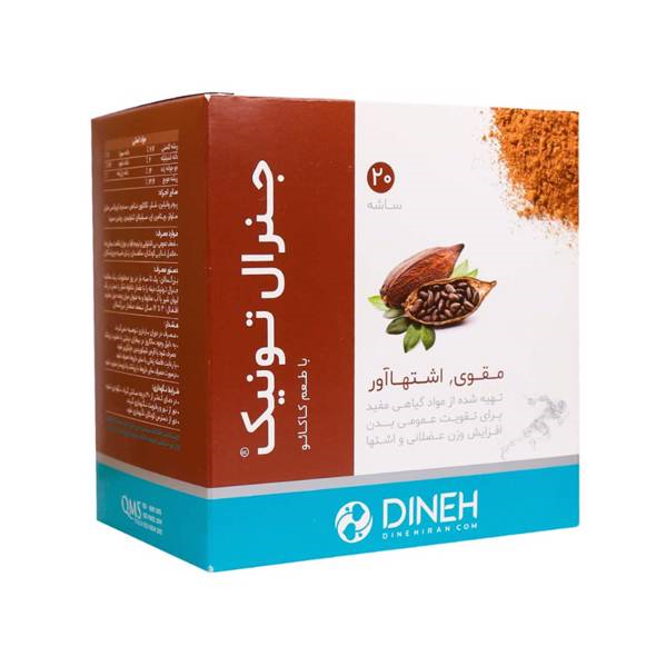 ساشه جنرال تونیک دینه با طعم شکلات 20 عددی (Dineh General Tonic) از مواد مفید گیاهی جهت تقویت عمومی بدن، افزایش اشتها و وزن عضلانی تهیه شده است. این مکمل به ترمیم قوای بدن در دوران نقاهت بیماری ها کمک بسزایی می کند و مکمل غذایی مناسبی برای کودکان، سالمندان، زنان شیرده و ورزشکاران می باشد.